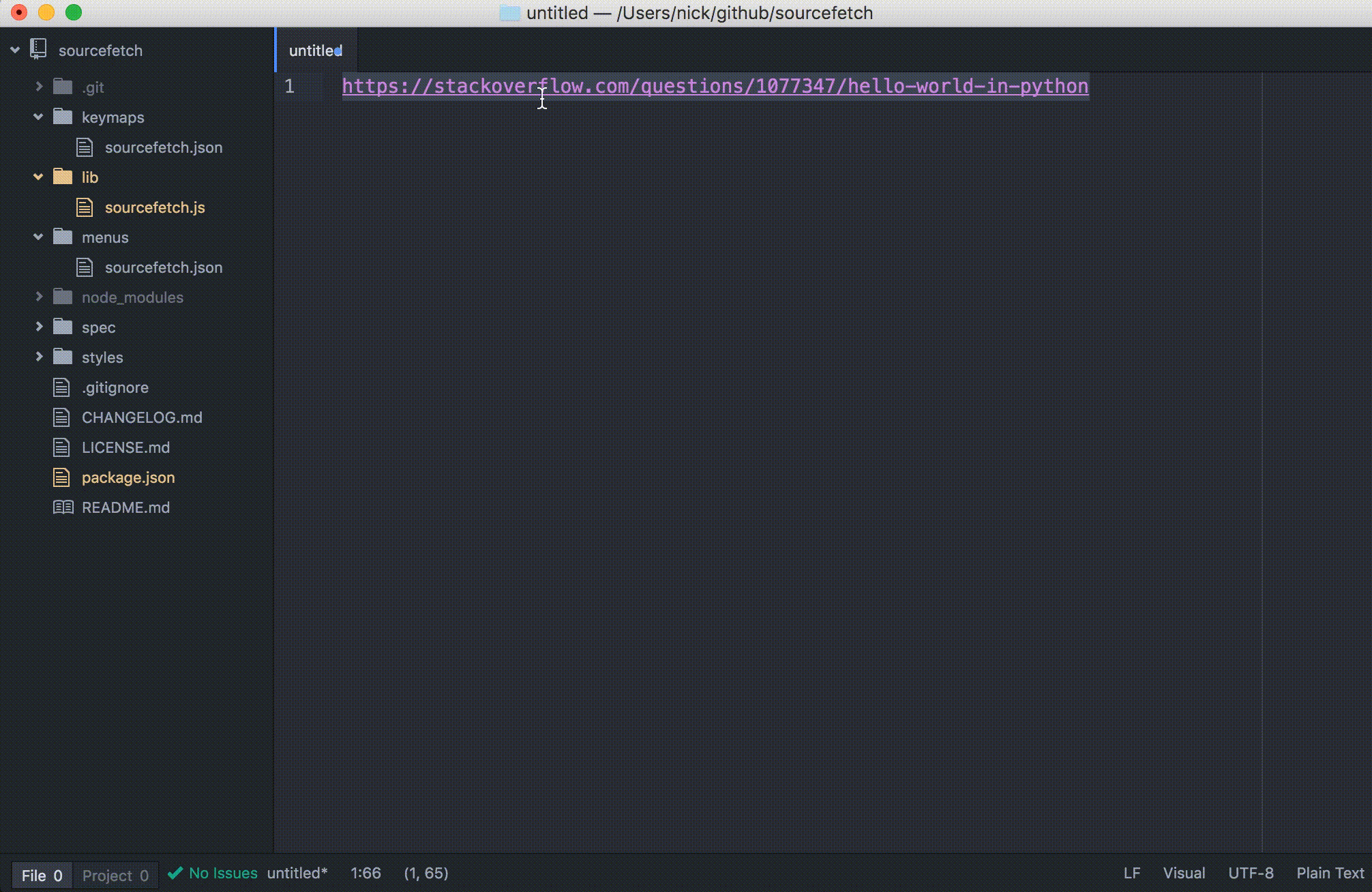 prompt where you can enter the name of the package – “sourcefetch”. - Press enter to generate the starter package, which should automatically be opened in Atom.