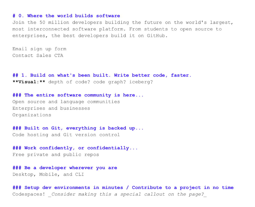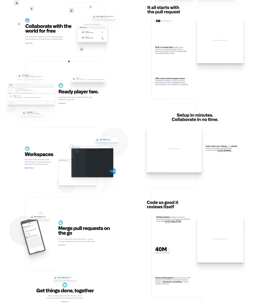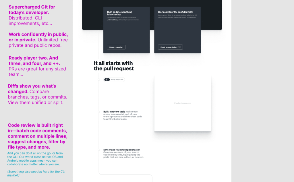As we iterated on the outline, we slowly increased our written fidelity, moving from lists of feature names to full headings and sentences that explain how awesome, powerful, or innovative each feature is on GitHub. As our words took shape, so did the design iterations, kicking off a back-and-forth collaboration across our teams as fidelity increased that ultimately accelerated and amplified our work.