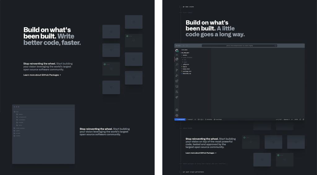 We also looked to a few moments on the page as record scratches—the times we wanted visitors to do a double take and say, “Wait, what!?”. Those two moments are in the middle of our homepage where we show how developers are working from anywhere with our amazing apps and how Codespaces is nullifying the days long process of setting up a dev environment. Our story is most closely connected to developers here—together we’ve all experienced fundamental shifts in how we write, review, ship, and maintain our software.