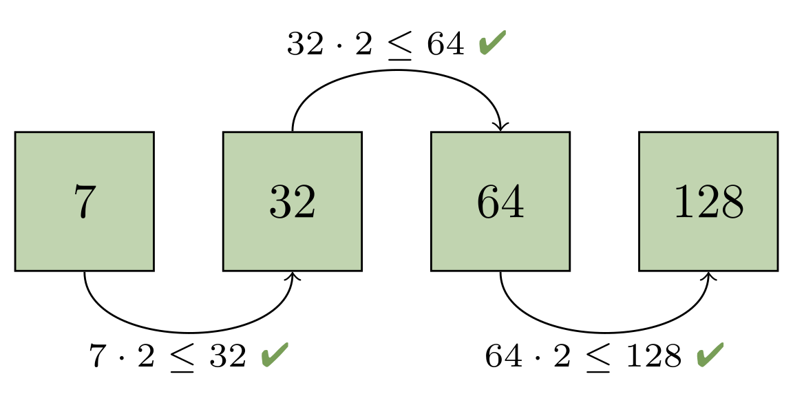 To better understand how this works, let’s work through an example on seven packs. First, Git orders all packs (represented below by a green or red square) in ascending order based on the number of objects they contain (the numbers inside each square). Then, adjacent packs are compared (starting with the largest packs and working toward the smaller ones) to ensure that a geometric progression exists: