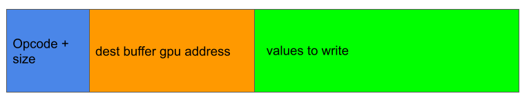 The fact that an opcode that is not in the command buffer appears in the kernel log seems to indicate that the GPU is seeing something that I don’t see, so the first step is to find out what the GPU is actually reading–but how? The commands that are used in the kernel code only include the write instruction, not the read instruction, so there is no obvious way to read from the GPU using the low level commands. To understand how to read, it is perhaps useful to take a closer look at how the write instruction works. The write instruction consists of 3 + num_to_write words, where num_to_write is the length of the write in words. The first word is constructed using cp_type7_packet(CP_MEM_WRITE, 2 + num_to_write), which encodes the write command CP_MEM_WRITE and the size of the command 2 + num_to_write. The next two words are just the GPU address of the destination buffer (which is of 8 bytes, so it splits into two words) and the rest of the instruction just contains the values to be written.