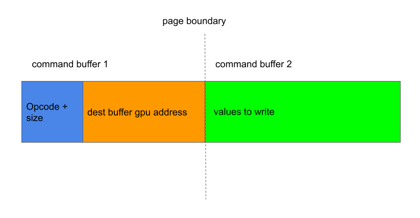 While this is impossible with a single buffer, it is possible with two command buffers that are mapped separately. Suppose we have two command buffers, each one page long, that are adjacent to each other in the GPU address space. If I put the GPU command near the end of the first buffer, so that the first three words of the command, which contains the GPU instructions, lie in the first buffer, while the values that are to be written lie in the second buffer: