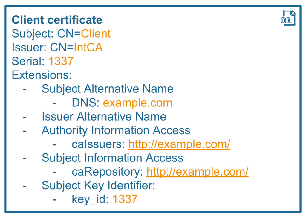 RFC 3280 defines some X.509 certificate extensions that can contain information about where to find the issuer and CA certificates. For instance, the Authority Information Access (AIA) extension contains a URL pointing to the Issuer’s certificate. If this extension is used for validation, there is a high chance that you can exploit it to perform an SSRF attack. Also, Subject, Issuer, Serial, and their alternative names can be used to construct SQL or LDAP queries, creating opportunities for injection attacks.