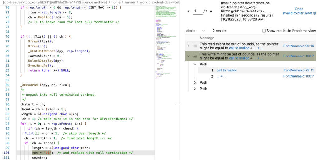 This is a CVE from 2018 on the LibX11 project, where a pointer that points to an element that is one past the end of the allocation is both read from and written to. When running cpp/invalid-pointer-deref on the project before applying the fix commit, we get exactly two results: one for the read and one for the write: