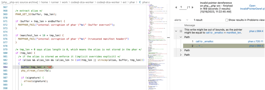 Another CVE we can now catch is https://www.cvedetails.com/cve/CVE-2016-10160/. This is an off-by-one error in the PHP interpreter, where a write to a buffer is guarded incorrectly and a write to an element one past the end of the buffer is possible with a cleverly crafted PHAR archive. When running cpp/invalid-pointer-deref on the project before applying the fix commit, CodeQL finds one result: the offending write: