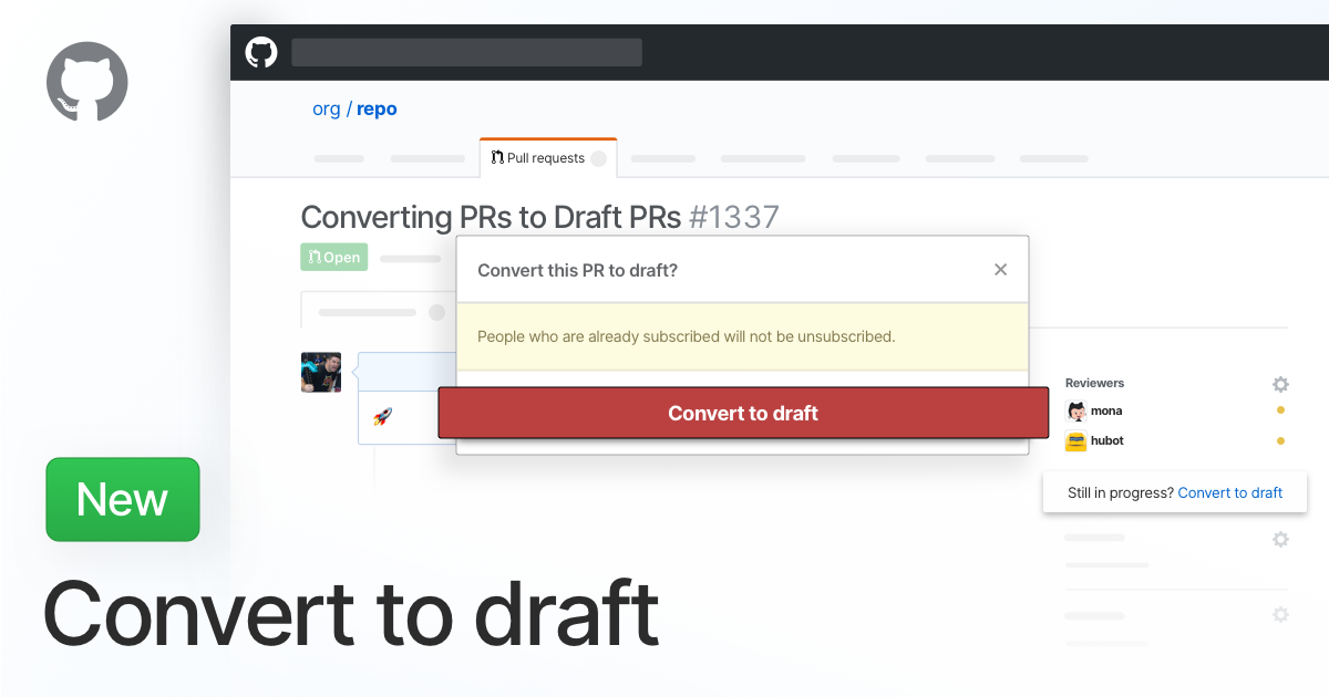 Previously, you could only create a draft pull request when opening a new pull request. Now you can convert an existing pull request into a draft at any time.