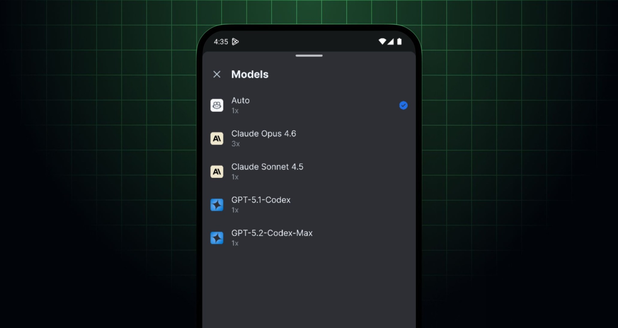 When you start a session in the app, use the model picker to select from: