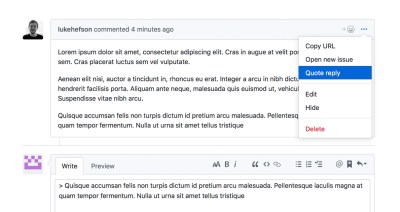 You can now quote comments in issues and pull requests by choosing Quote reply from the comment’s options menu. This will paste quoted contents of the comment into the text…